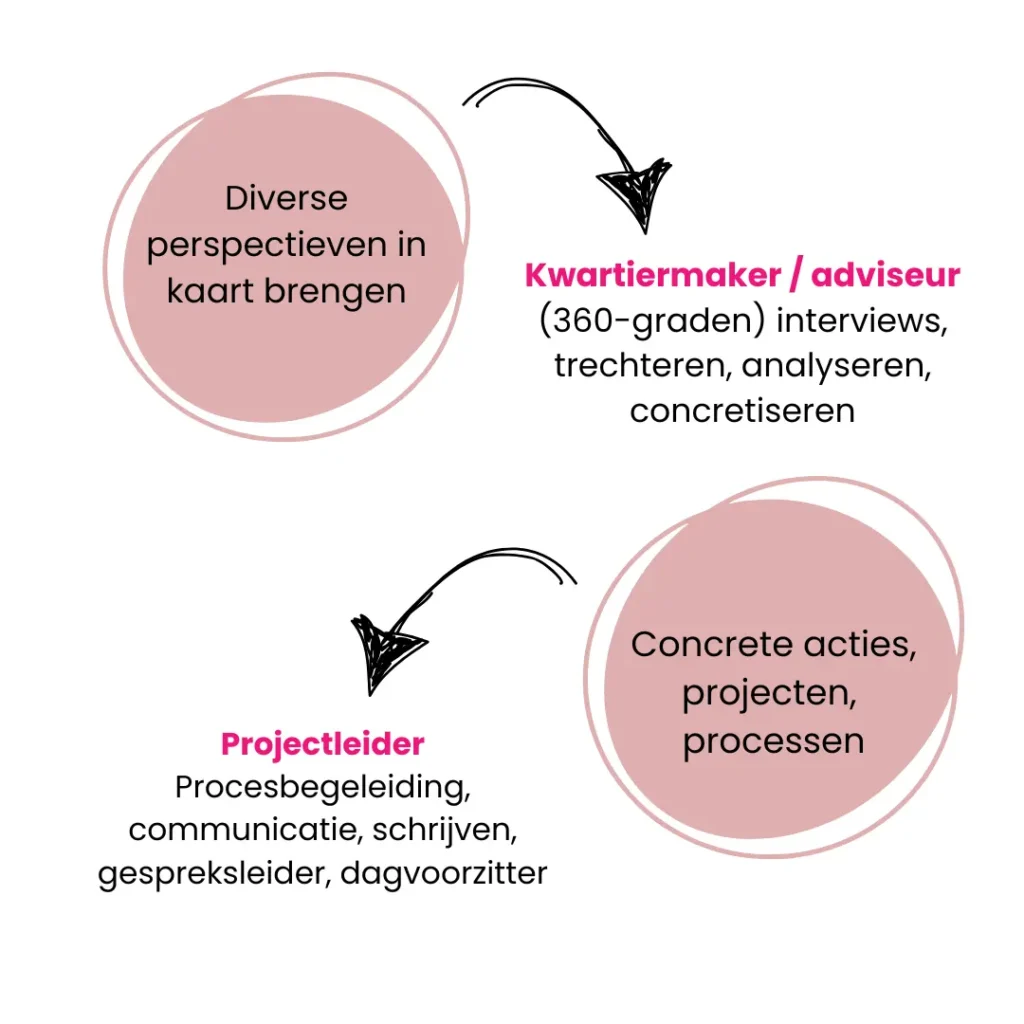 Ik denk eerst graag met je mee over wat er nodig is. Wat zijn de goede dingen om te doen? En voor wie is dit van belang? Met die vragen ga ik graag aan de slag.